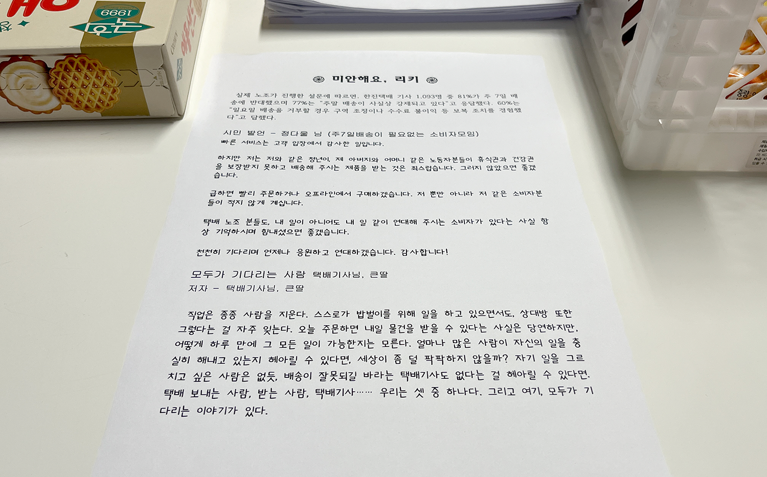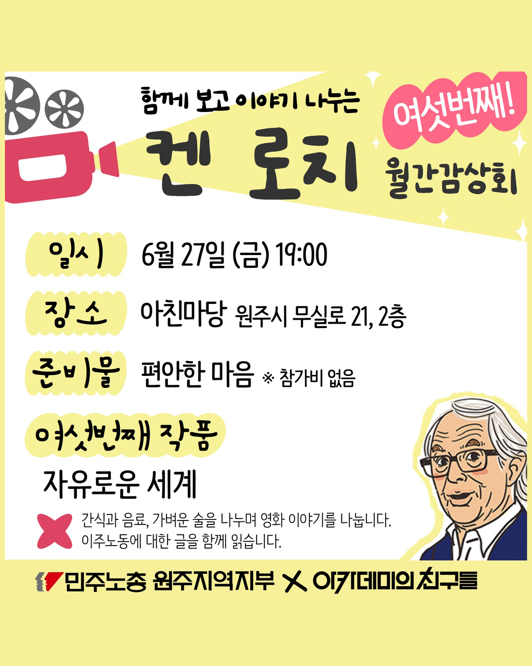 다섯 번째 모임! 켄 로치 감독의 영화 <미안해요, 리키>를 다뤘습니다. '고용관계가 아니라 협업관계'라고 포장된 플랫폼 노동의 부조리한 현실에 많은 분들이 안타까운 마음을 이야기했습니다. 열악한 노동환경이 점점 사람을 절박하게 만드는 과정을 생각하며 훌쩍이기도 하고, '개인사업자'라는 속성을 비용 절감에 악용하는 플랫폼 노동의 구조를 보고 분노하기도 했습니다.😡 그러다 영화제목에 사과(미안해요)가 들어가서 사과🍎과자를 사 오셨다는 분 덕분에 모두가 깔깔 웃기도 했던, 즐거운 시간이었습니다!😉