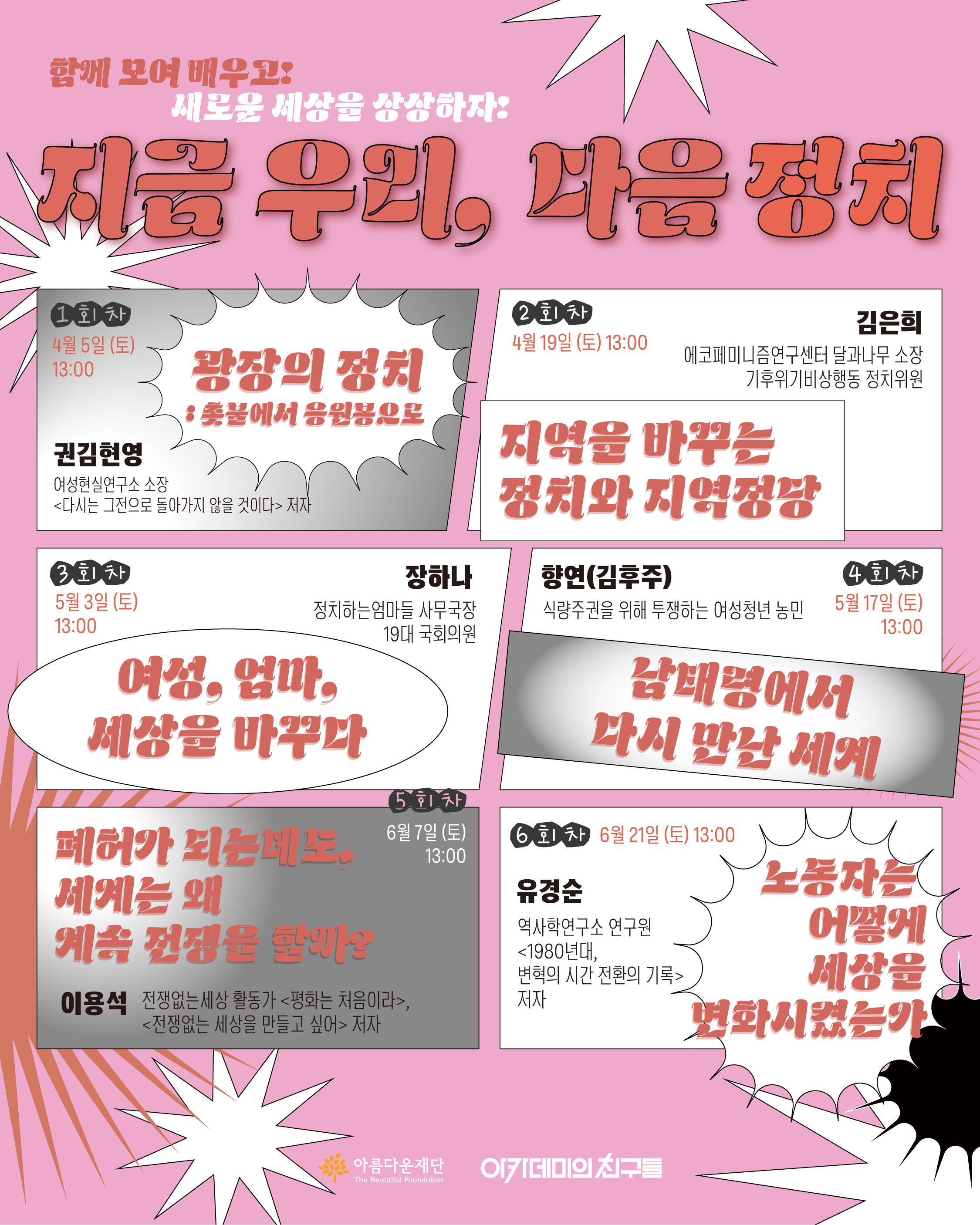 안녕하세요. 아카데미의 친구들입니다!✨ 추운 겨울이 지나고 봄, 새로운 세상을 꿈꾸는 시기를 앞두고 있습니다. 모두들 안녕하신가요? 파면 이후 대선, 미래의 대한민국을 이야기하는 수많은 공론장 사이에서 아친도 의미 있는 목소리를 내고 있습니다.