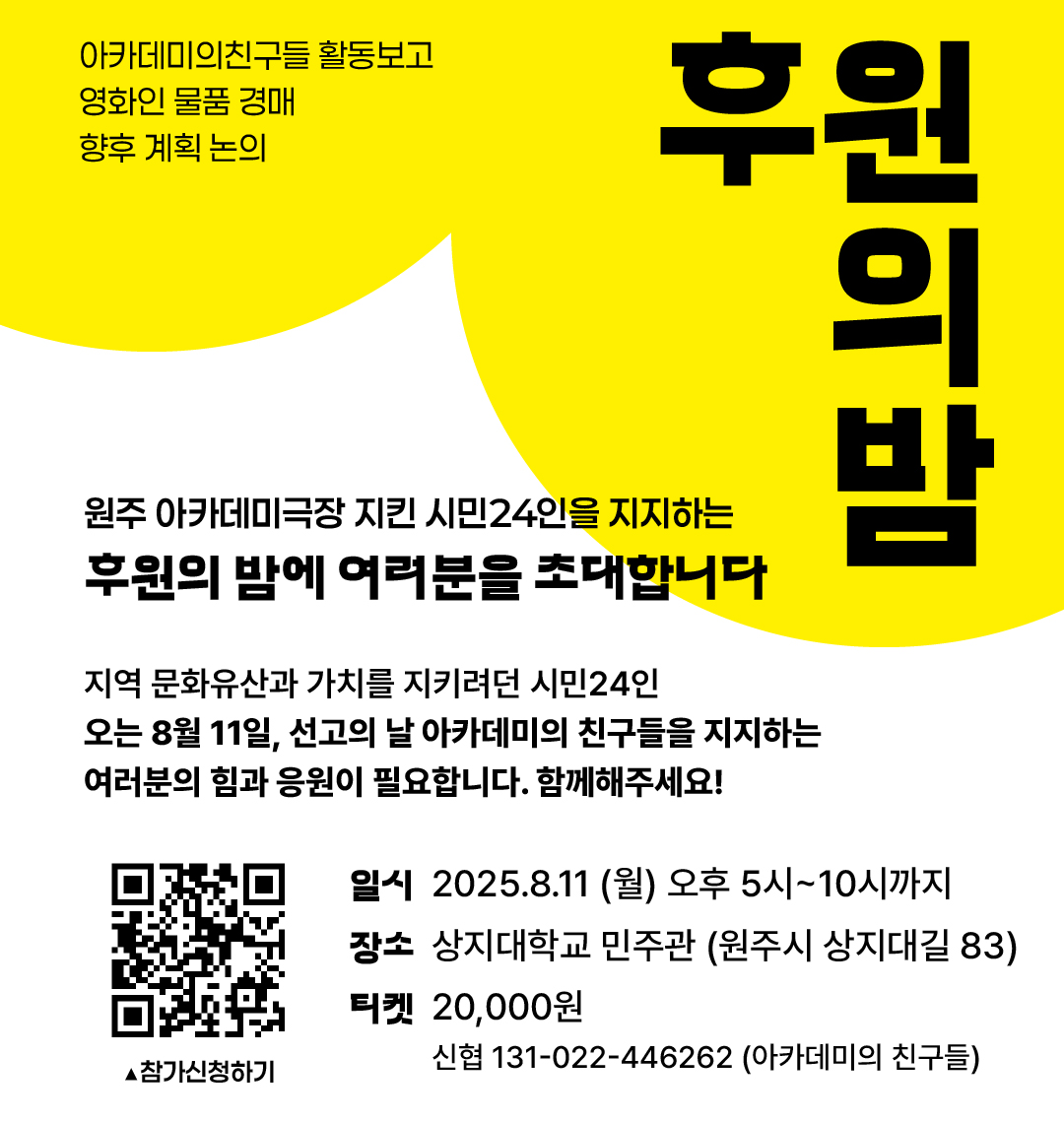 원주 아카데미극장을 지킨 시민들을 응원하기 위해 후원의 밤을 엽니다. 시민 24인에 대한 1심 선고가 발표되는 날이에요. 선고 결과와는 상관없이, 응원의 마음으로, 모여서 이야기 나누어요! 후원행사에서 아카데미의 친구들 활동 공유와 향후 계획에 대한 논의도 함께 하려고 해요. 법률대응비용 마련을 위한 영화인 물품 경매도 진행됩니다. 아카데미의 친구들을 지지해주신, 여러분을 초대합니다!