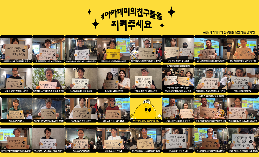손피켓 챌린지도 진행중입니다! 지난 7월 19일 서울에서 열린 영화산업 위기극복 영화인연대 일일호프에 참석한 많은 영화인들이 챌린지에 참여해주셨어요! 종이에 손글씨, 태블릿, 어디에든 가능해요. '#아카데미의친구들을지켜주세요'라고 적은 뒤 사진을 찍어 SNS에 공유해주세요! 더 많은 사람들에게 아카데미의 친구들이 처한 상황을 함께 알려주시길 부탁드립니다!🙌 |