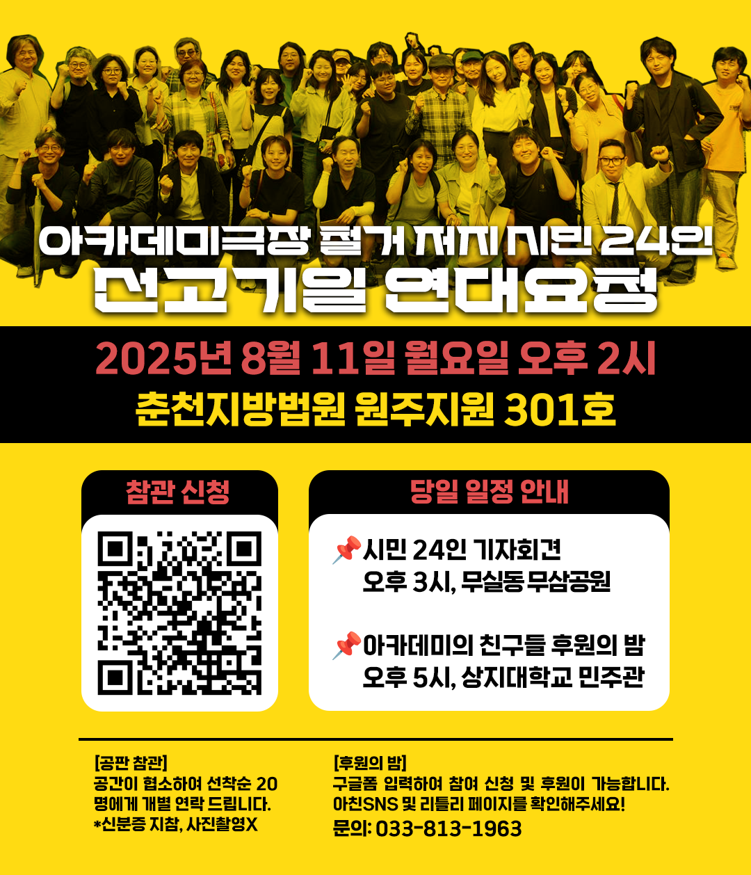 아카데미극장을 지키던 시민 24인에 대한 검찰의 실형 구형, 선처 취지의 탄원서에 2,800여 명이 연명(발신일 기준)을 해주셨습니다. 감사합니다! 보내주신 마음을 잘 모아서 법원에 제출하겠습니다. 탄원서 연명은 7월 30일까지 열려있습니다. 그리고 탄원서 연명 게시 이후 계좌를 통해 직접 보내주신 후원금은 법률비용으로 따로 분류하여 정리하고 있어요. 원주시에 의해 고발당한 시민들의 재판에 필요한 비용으로 소중히 사용하겠습니다!
