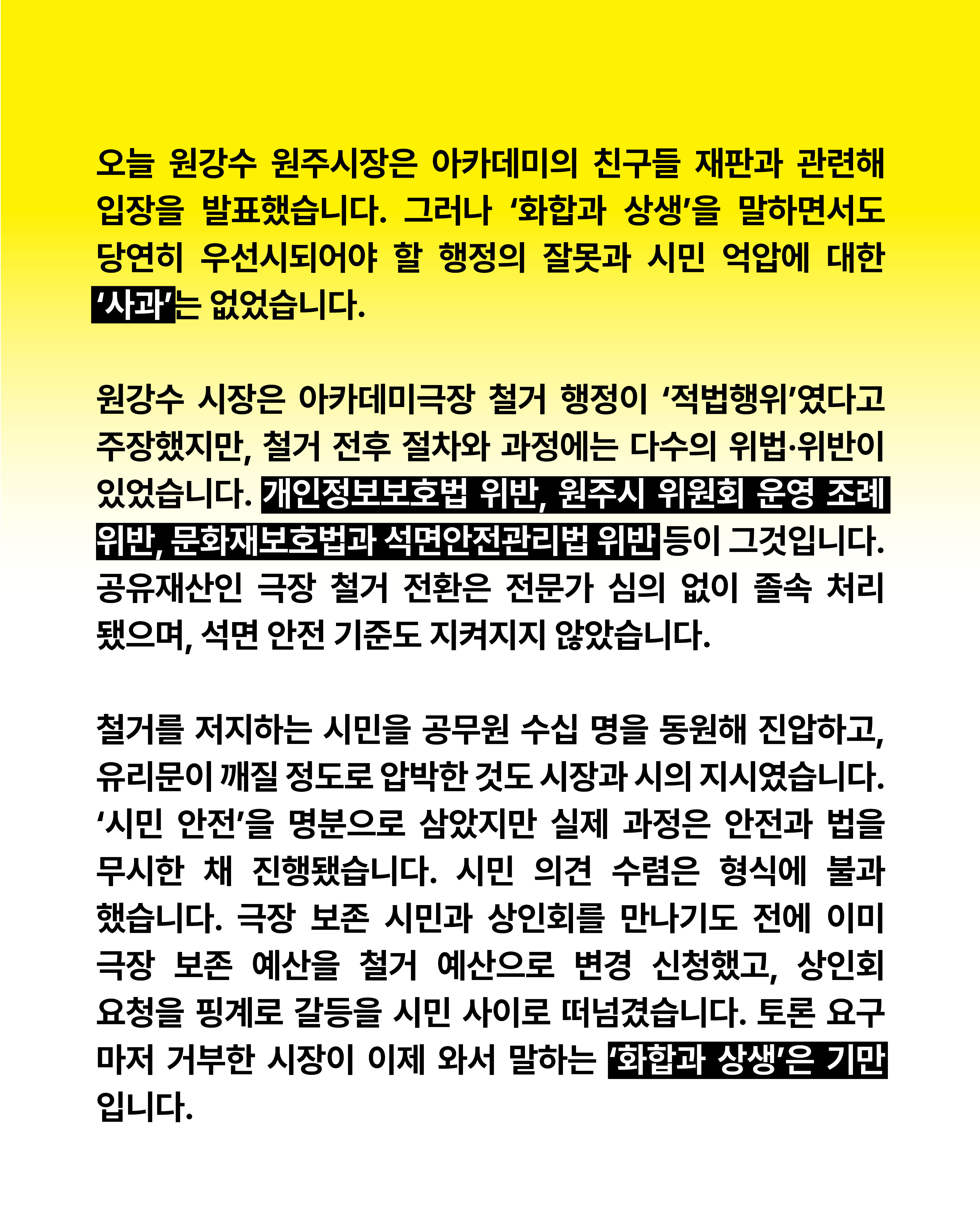 원강수 퇴출대작전, 요원들 출동하라!! 아카데미극장 지킨 시민을 고발하고, 공공기관 측근 비리를 묵인하는, 일 못하는 원강수 퇴출 대작전을 시작합니다📢