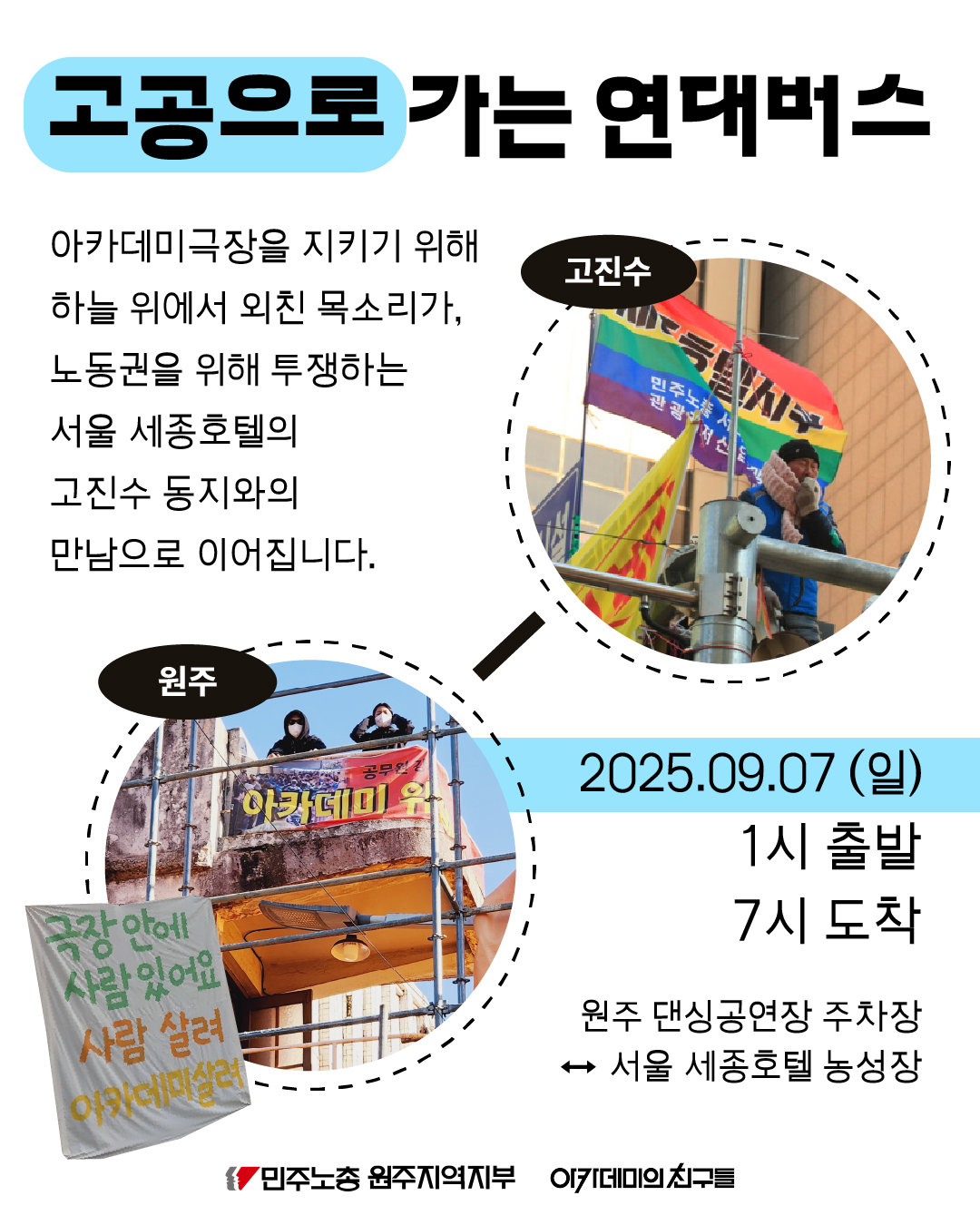 📌 2025년 9월 7일 (일) 13:00~ 📌 원주 댄싱공연장 ↔ 서울 세종호텔 농성장