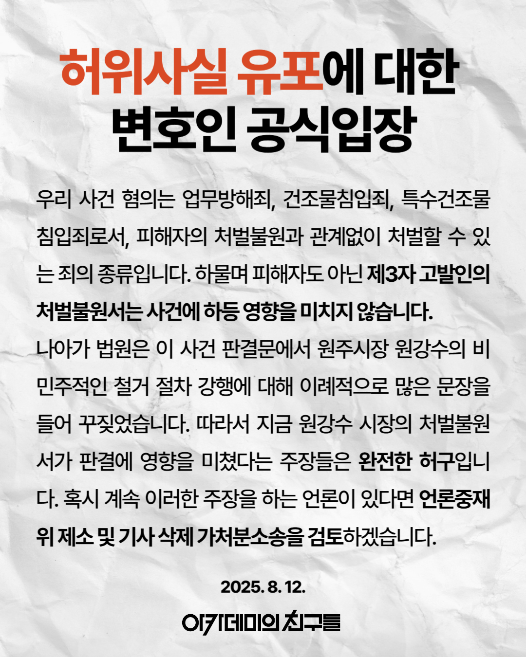 이번 판결은 시민들의 정당한 권리와 행동이 법적으로 인정받은 의미 있는 결과입니다. 이것은 원주뿐만 아니라 전국에서 보내주신 지지와 탄원, 마음을 모아주신 수많은 분들의 연대 덕분입니다. 우리는 그 과정에서 더 많은 사람과 연결되었고, 그 힘이 바로 공동체가 지켜야 할 가치임을 다시 확인했습니다. 진심으로 감사드립니다. _기자회견문 일부