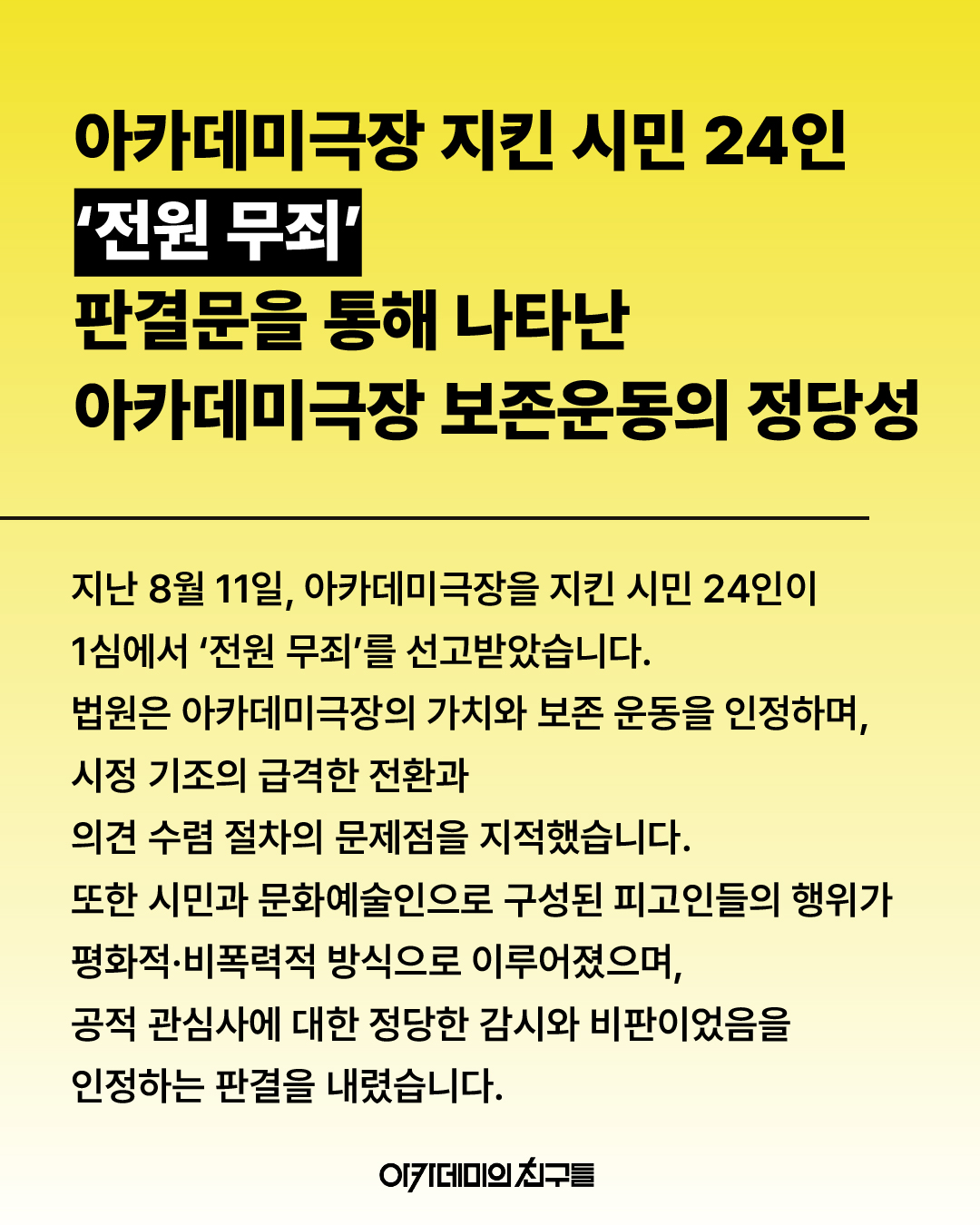 1963년부터 시작된 이야기, 2016년부터 시작된 아카데미극장 보존활동, 100인 100석 프로젝트와 아카데미 원탁회의, 2022년부터 네 차례나 시도했던 시정정책토론청구, 수천 명이 함께한 서명운동, 수없이 반복한 집회와 피켓팅, 하염없이 극장을 바라보며 지키던 노란 텐트, 단식 농성과 고공 농성, 허망하게 철거 현장을 바라보던 슬픈 눈과 이대로 흩어질 수 없다는 다짐, 전국에서 모인 응원과 지지가 지금의 아친을 만들었습니다. 모두가 함께 만들어온 역사죠. 시민 24인에 대한 1심 재판 결과가 '전원 무죄'로 나올 수 있었던 것은 여러분 모두의 덕분이에요. 고맙습니다! 비록 검찰이 항소를 결정하면서 2심을 준비하게 되었지만, 1심에서 마주한 가능성을 가지고 계속 싸워나가겠습니다! 또한 새로운 '아카데미극장'을 상상하고 문화민주주의와 커먼즈 가치를 실현하기 위한 다양한 활동을 하고 있답니다. 이어지는 아친의 활동, 계속 함께해 주세요!